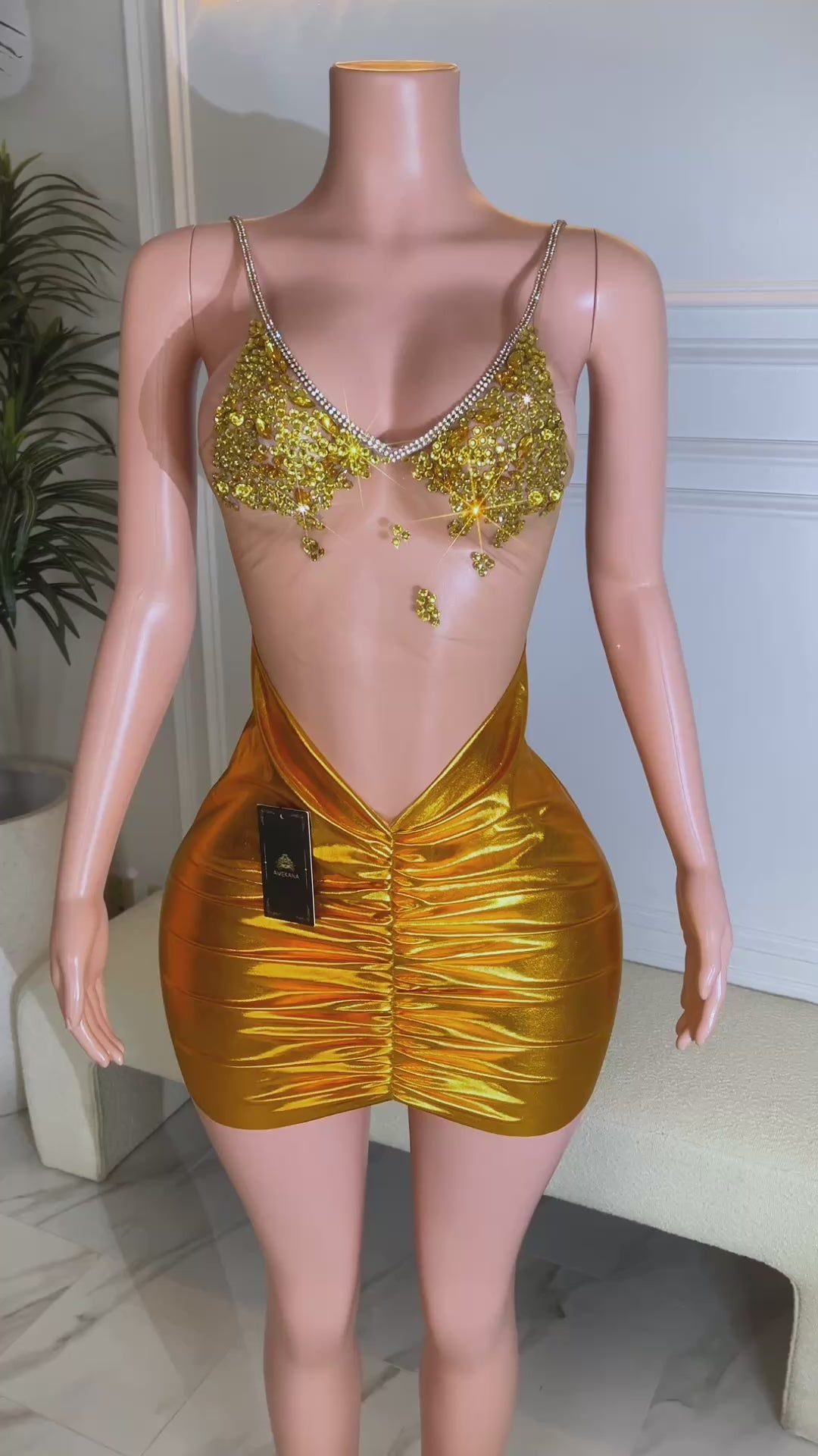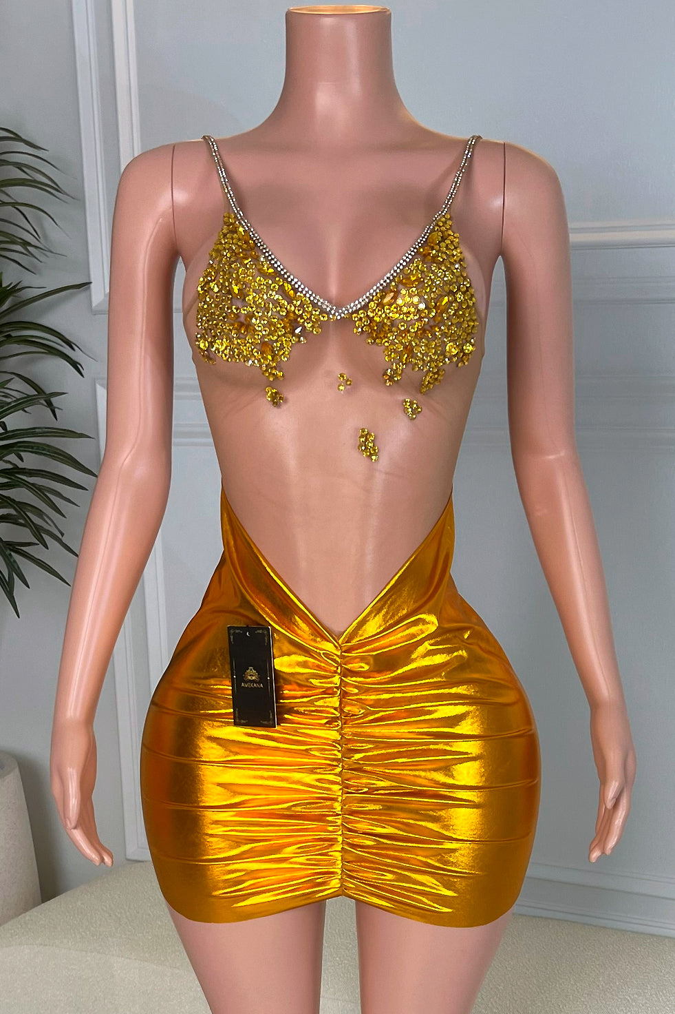 Top Design: Deep V illusion mesh with yellow crystal appliqué over the bust