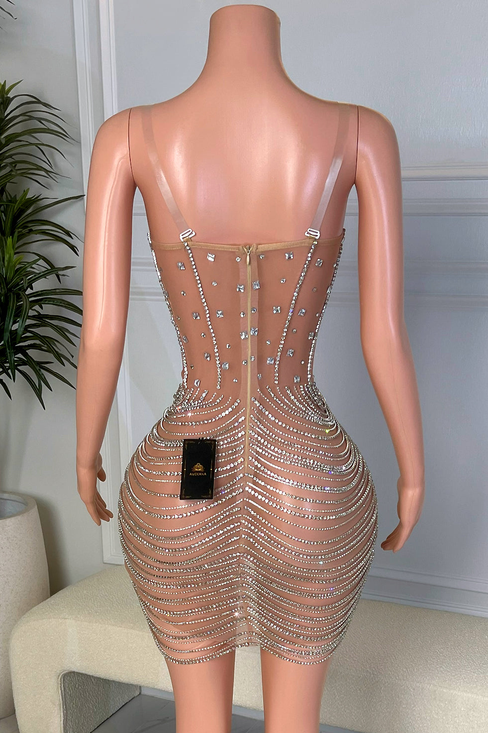Material: Nude mesh base with structured cups and full rhinestone detailing