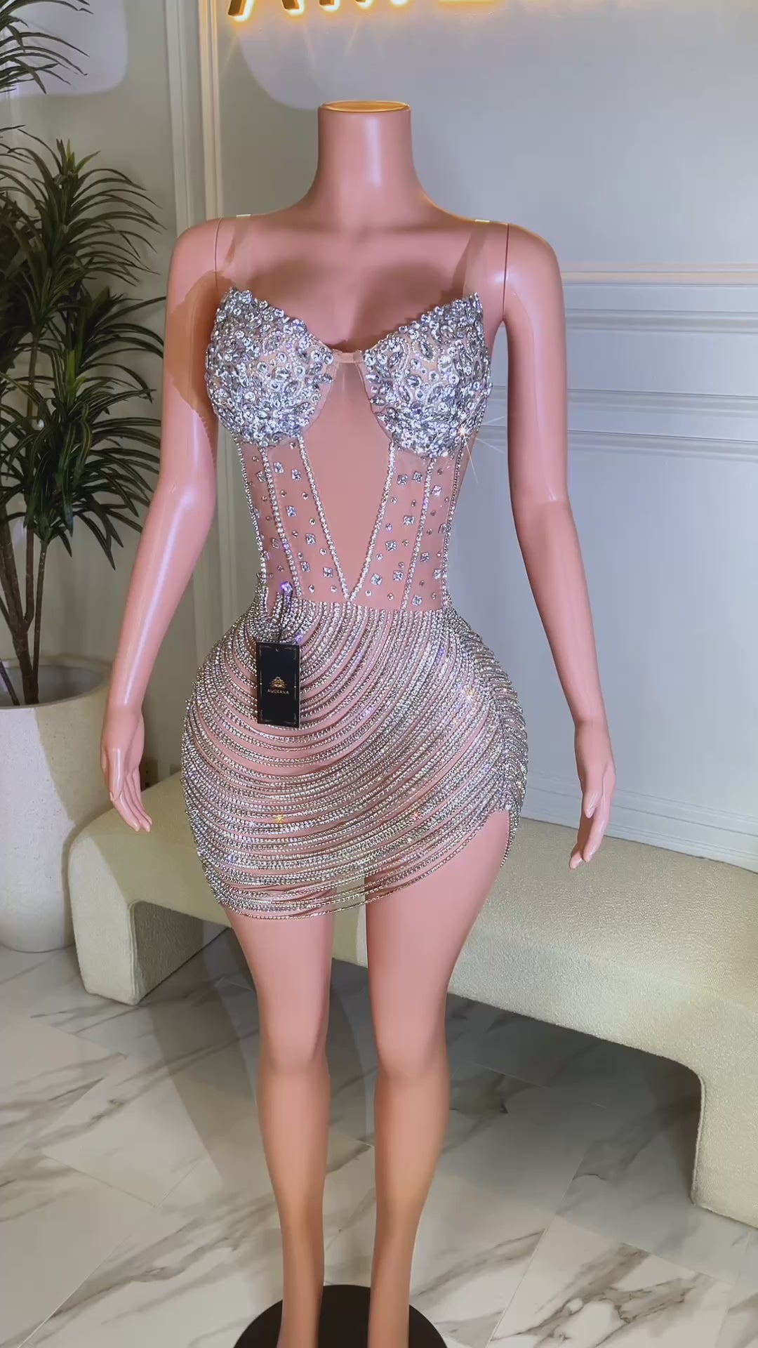 Skirt: Draped with cascading rows of silver rhinestone chains creating a shimmering wave effect