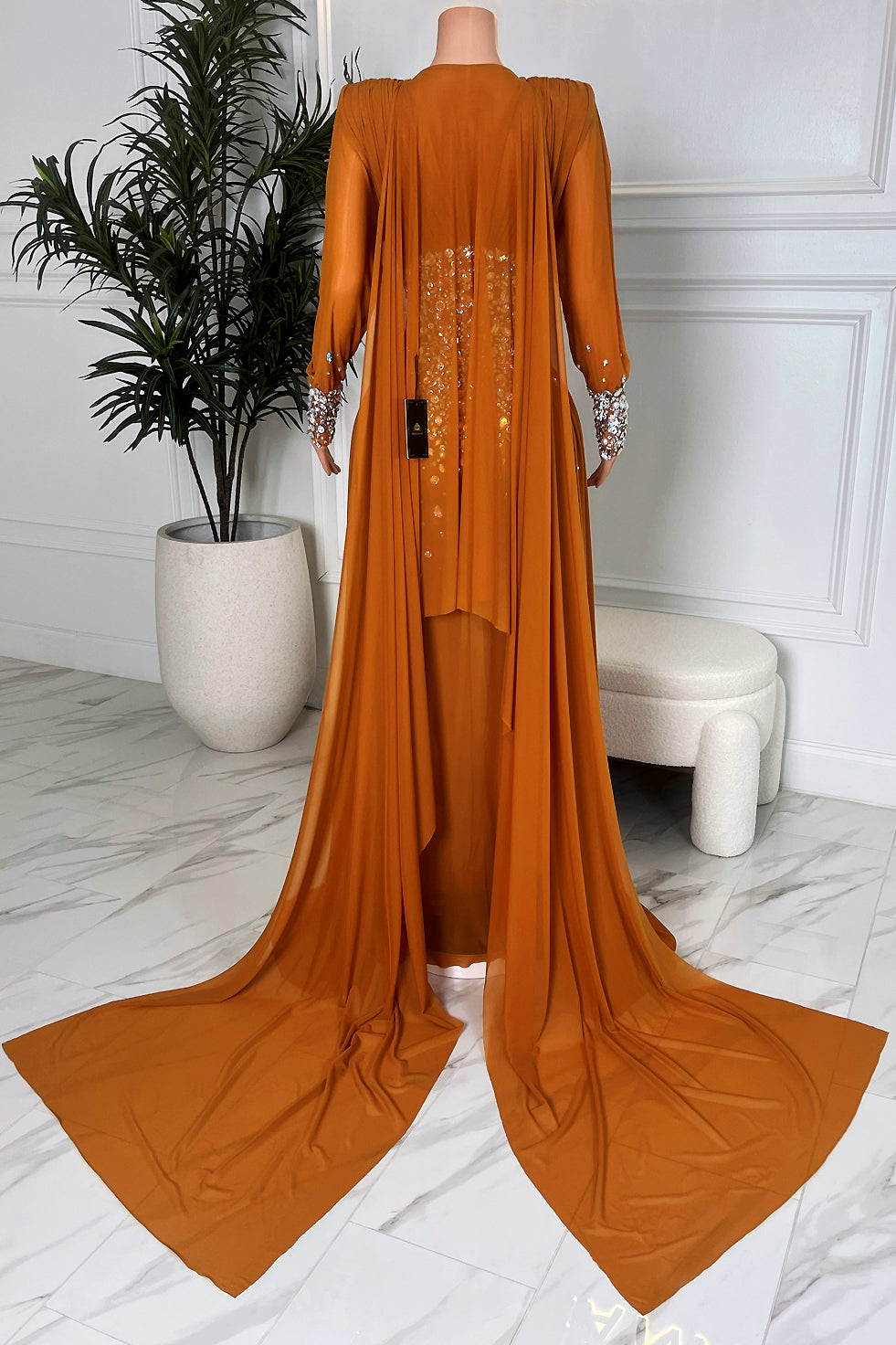 Rich cognac brown maxi gown with opal rhinestone detailing