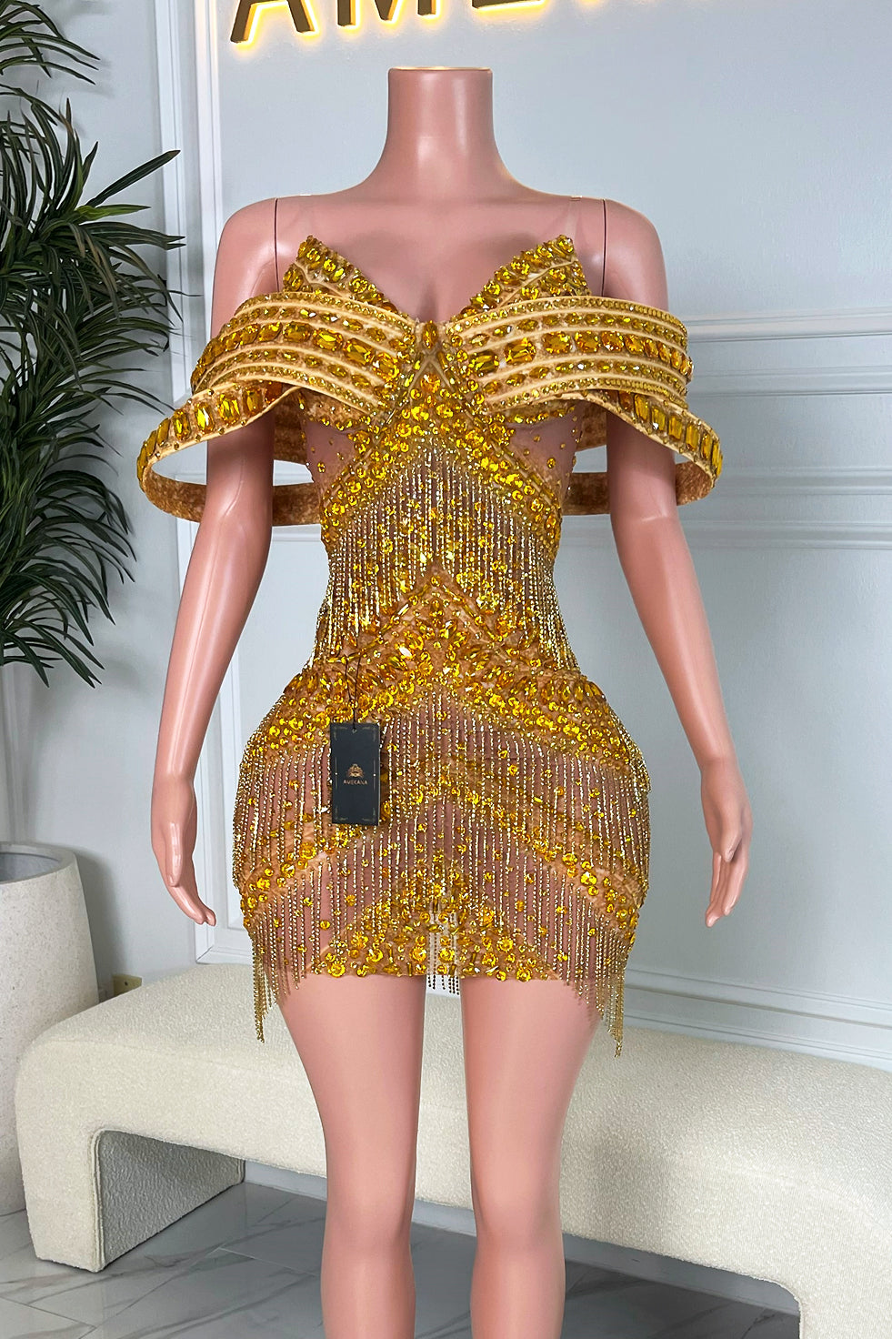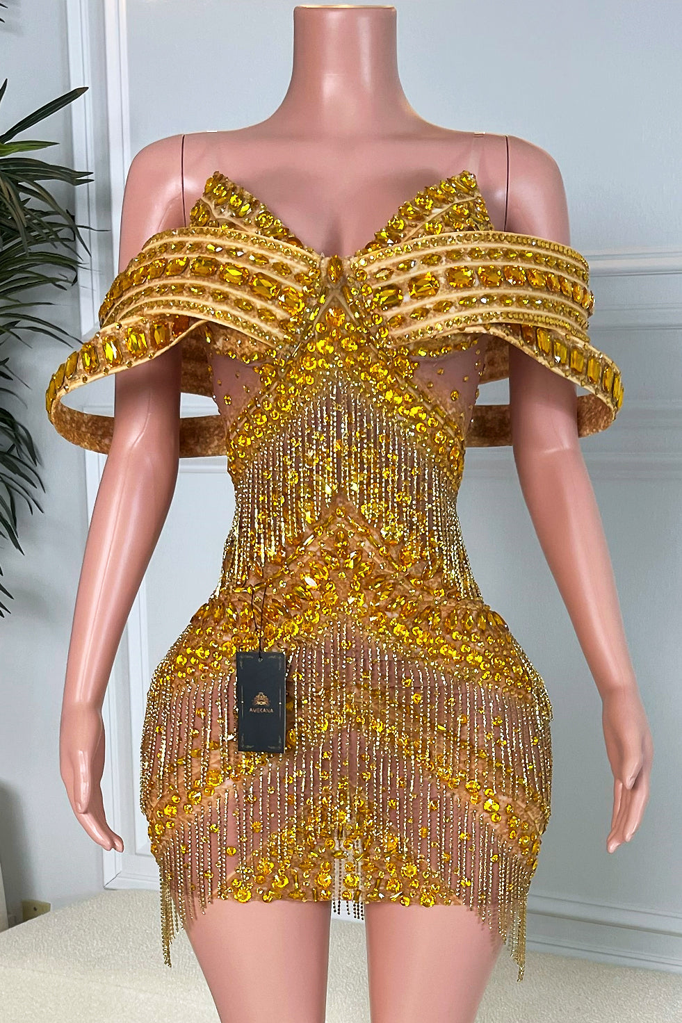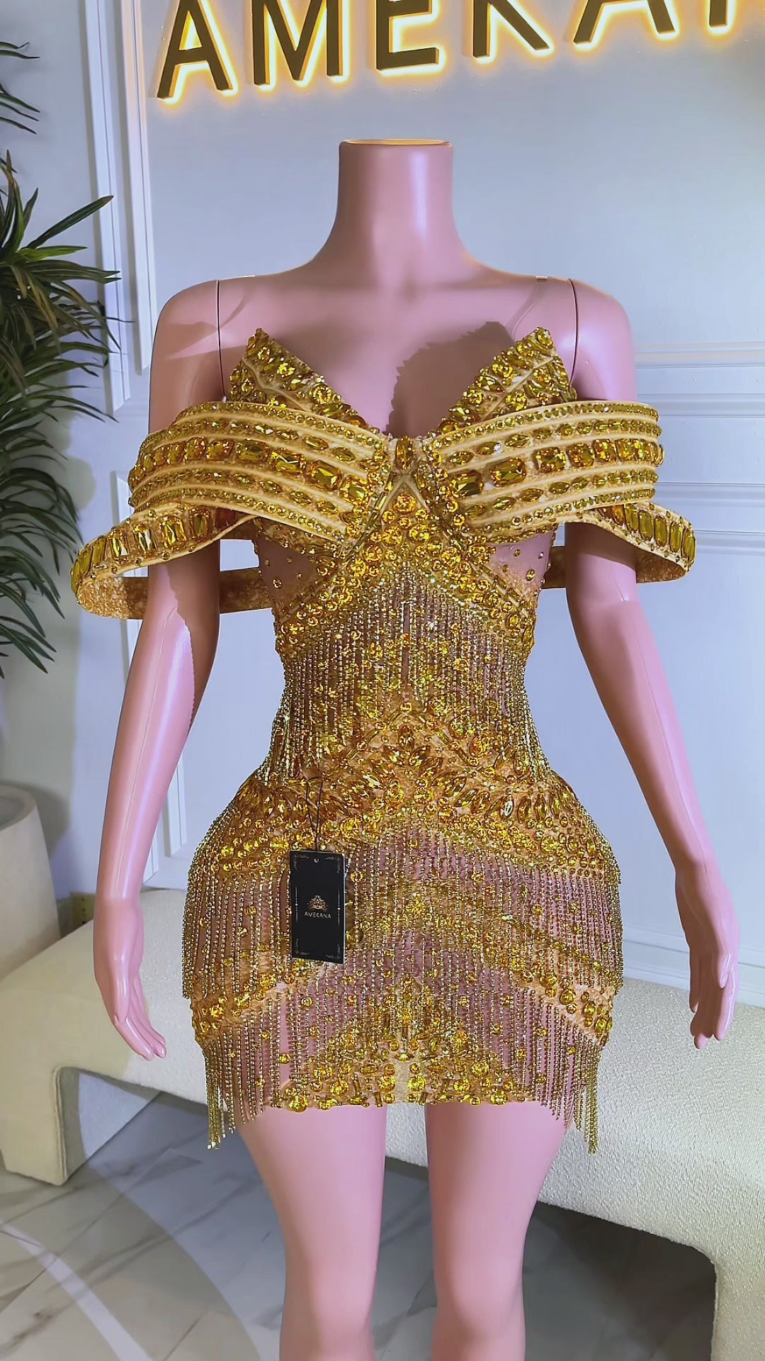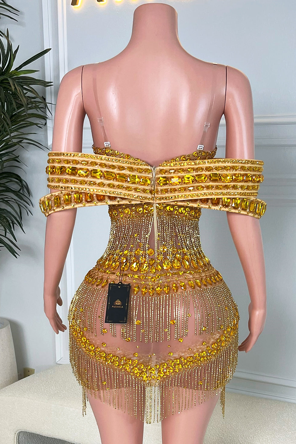 Design: Off-shoulder sculptural neckline with structured bands adorned with large golden gemstones and chain tassels